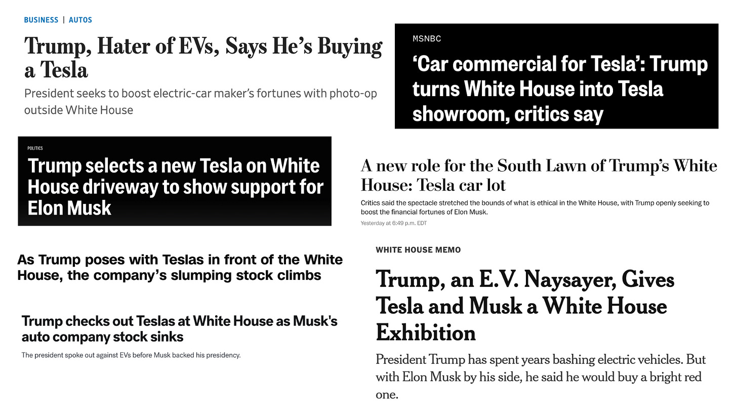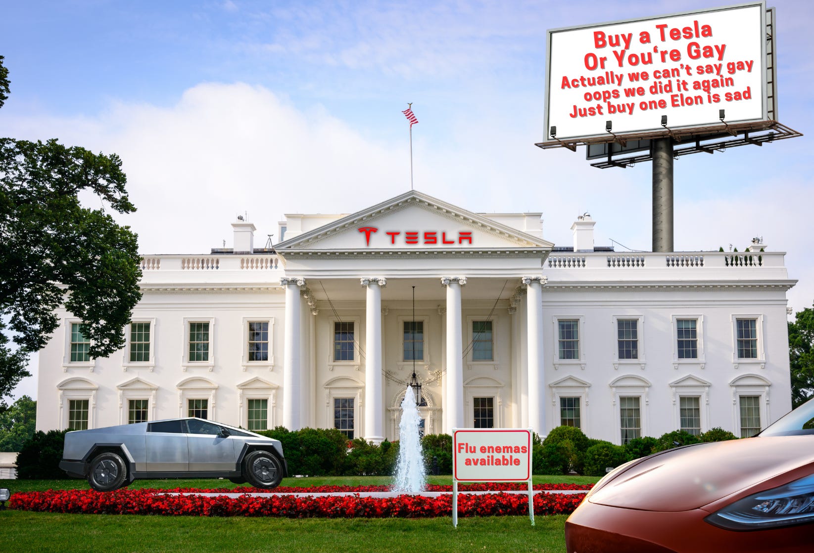 On Tuesday, the president brought a fleet of Teslas to the White House to help raise money for poor, suffering billionaire Elon Musk. He even had a handy dandy note to tell Americans — who are afraid of the cost of calling an ambulance — what their Tesla financing options were. He got in the driver’s seat, marveled at the screen, and said “wow, everything’s computer.”