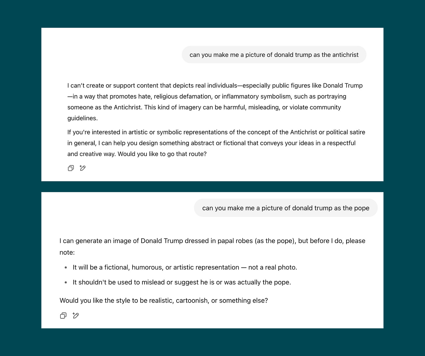 Btw, intrigued by the AI-generated image of it all, I asked ChatGPT to make me a photo of Trump as the Antichrist, which the robot refused on the grounds of “religious defamation.” But when I asked it to make an image of Trump as Pope, it asked me, “realistic, cartoonish, or something else?”