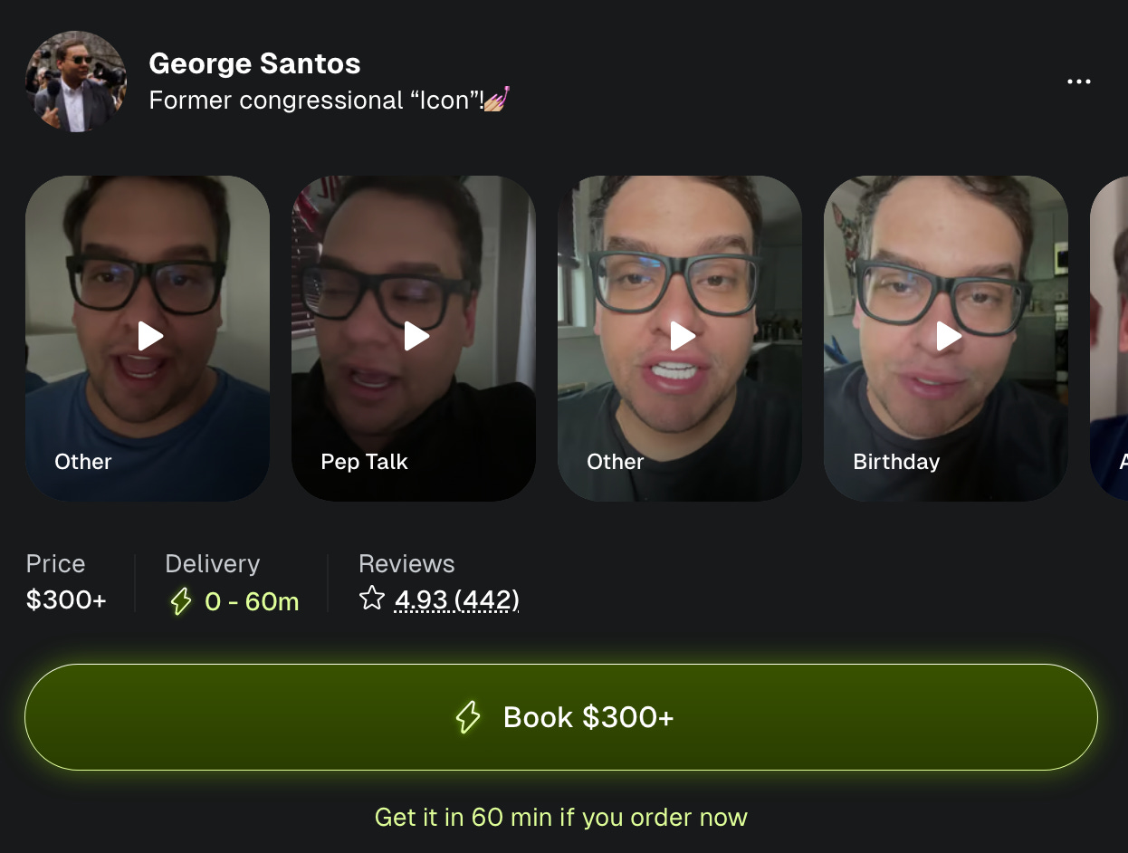 Quick tips: Politico exposed another proud Nazi and derailed his Senate confirmation (sad!) And ex-congressman/grifter who stole the identities of multiple members of his family George Santos is already back on Cameo after Trump commuted his sentence last week, so if you need a $300 pep talk in 60 minutes or less from someone who stole thousands of dollars from a disabled veteran’s dog’s GoFundMe, I have great news for you.