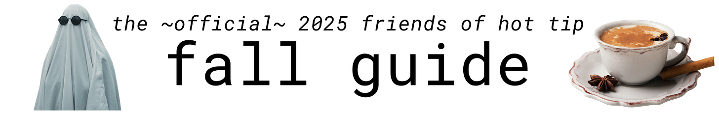 It’s a crisp 87°F here in Los Angeles, aka the perfect time for me to ask my friends for their hottest tips to get them in the autumnal mood. This special edition of Hot Tip is indeed coming as the world’s ~general dumpsterfireness~ is heating up, so I hope it provides a cozy respite. We’ll get back into the news again, soon.