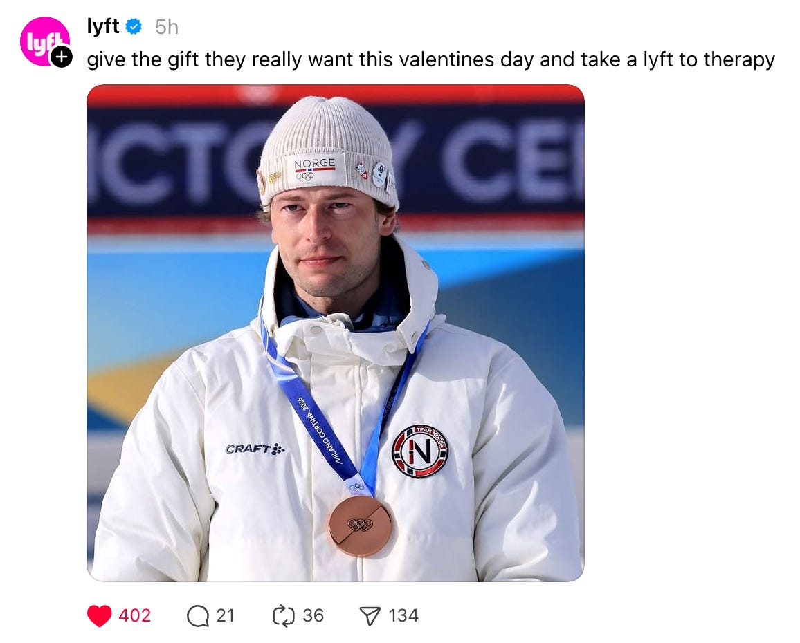Other winners include: The drone shots that have yet to hit an athlete, Ilona Maher and her sisters having the trip of a lifetime, and the giant Nutella dispenser in the athlete dining hall. On the loser side we have the Norwegian guy who randomly admitted to cheating on his ex-girlfriend in an attempt to win her back (?), to which this publication says—run, girl (or as the case may be: ski, girl.)