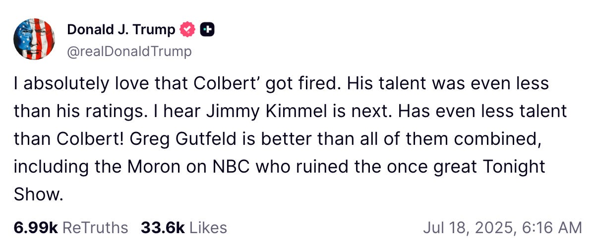 But I’m also not a dumbass. Paramount is calling the cancellation of the Peabody-winning highest rated late night show a “financial decision” just days after Colbert criticized them for the “big fat bribe” they had just offered the Trump Administration to the tune of $16 million, all in exchange for their Skydance merger going through. Jon Stewart, whose Daily Show is also on a Paramount-owned network, openly shared the same criticism. (Not to mention the close ties that Skydance owner David Ellison has with Trump or the fact that he’s apparently musing about buying The Free Press amid all this supposed financial insecurity.)